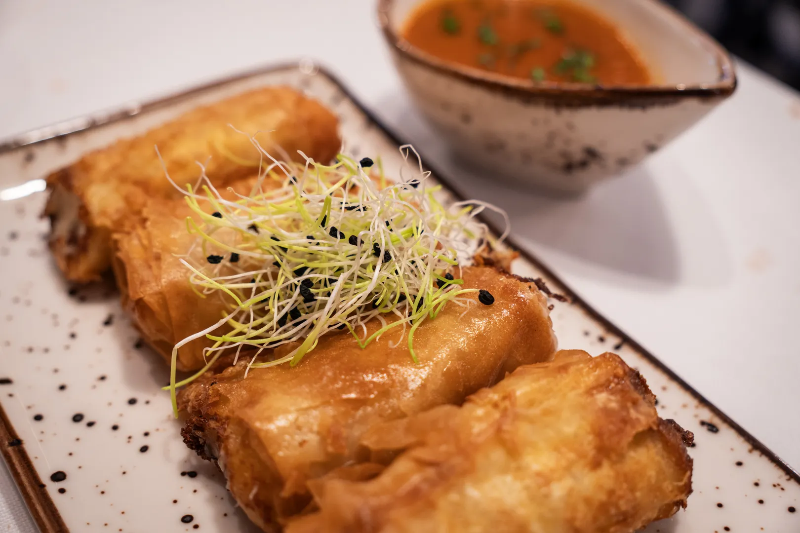 | Rollitos de pasta filo de merluza y gambón con salsa de pimientos | 9,00€ | 15,00€ |